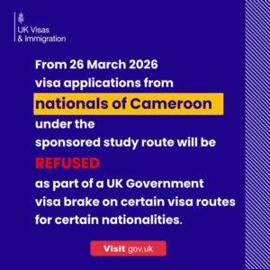 The UK government announced a temporary suspension of new UK study visa applications for Cameroonian students as part of broader immigration reforms. The decision forms part of what authorities described as an “emergency brake” mechanism targeting specific visa routes and nationalities considered high-risk under current migration assessments.